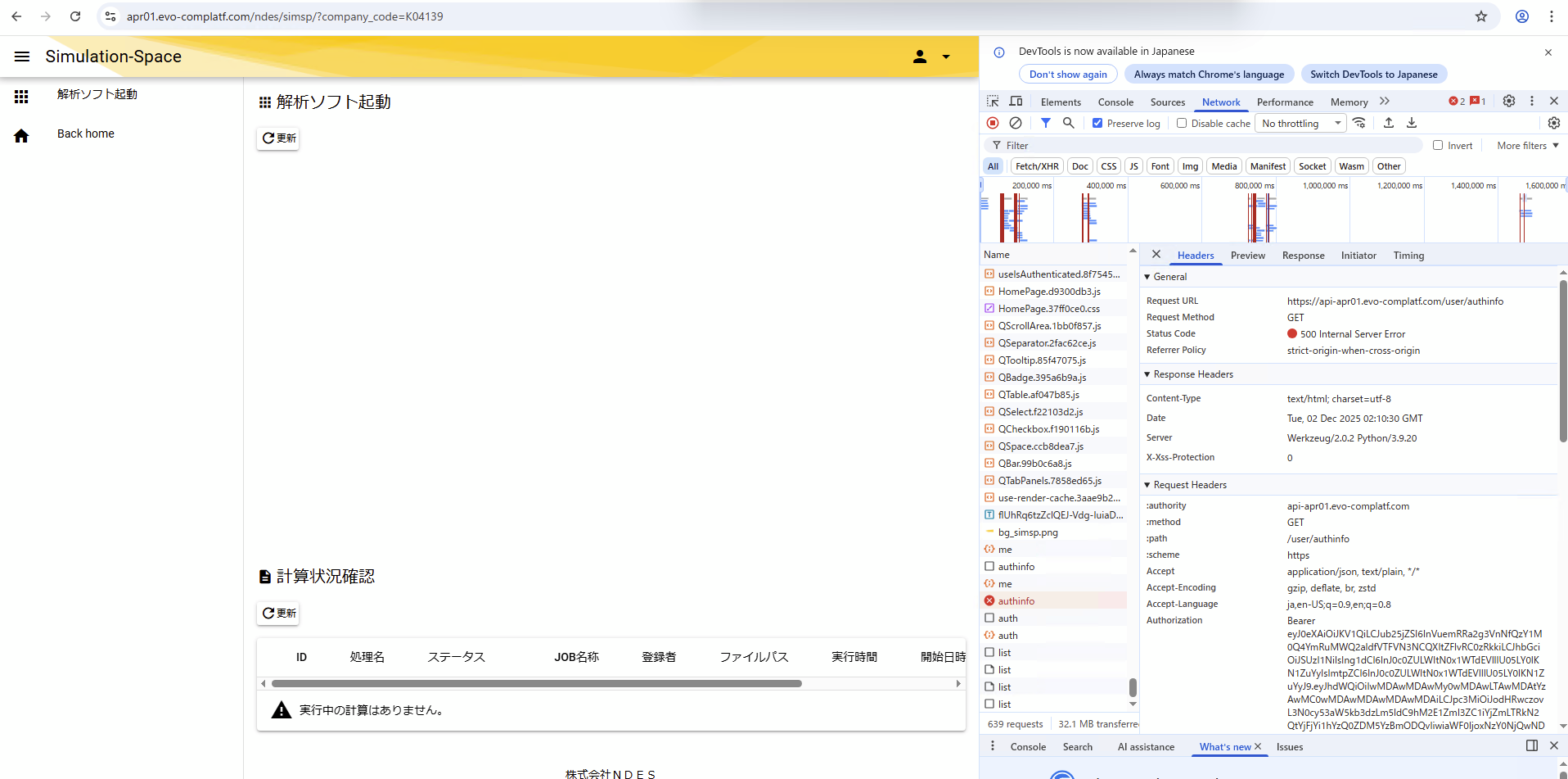 新規の本契約ユーザーで、evo領域のアプリポータルサイトを開くと500番のエラーが出て、メニューや解析ソフトが表示されない