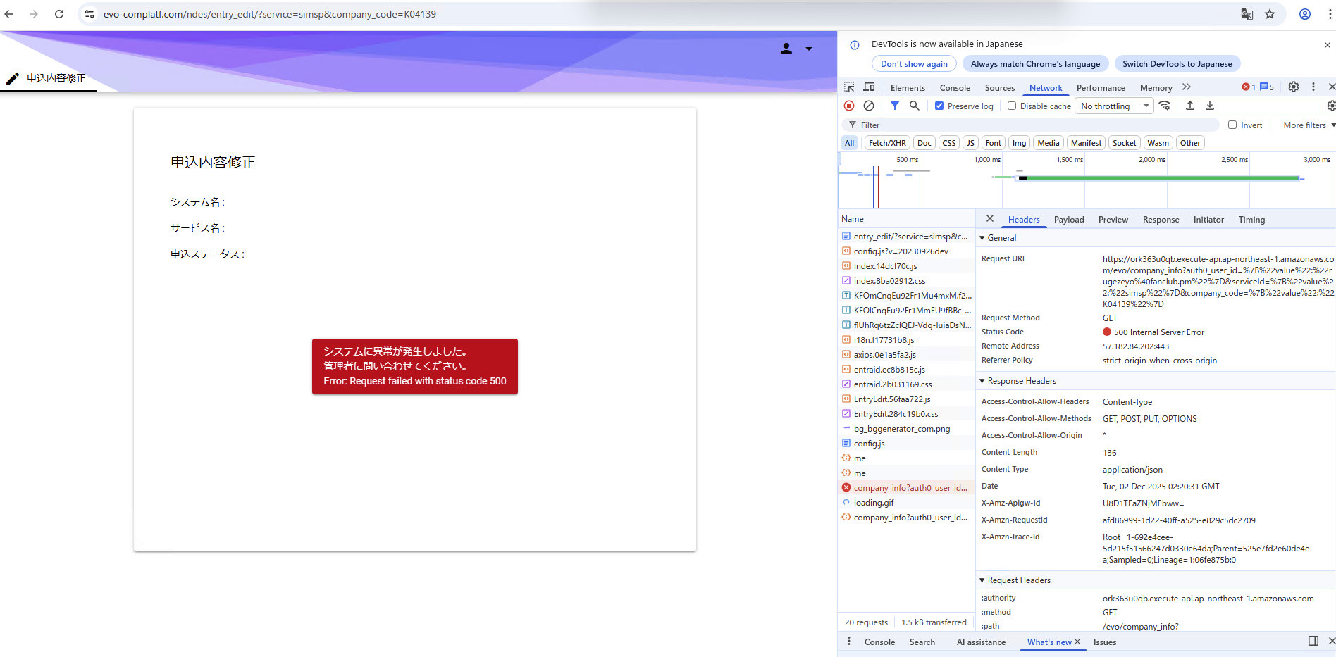 完了【共通PF】申込内容修正サイトを開くとエラーが出て情報が表示されない