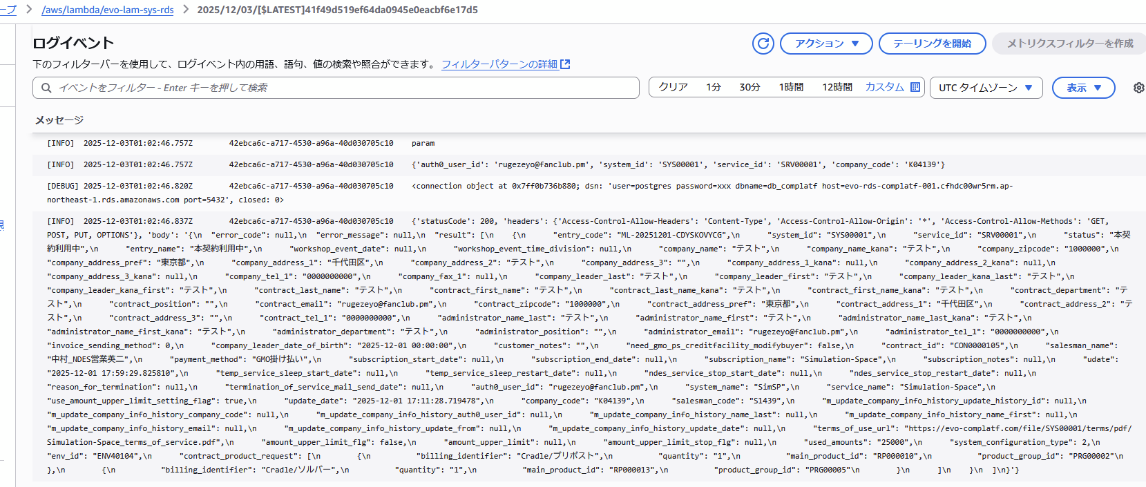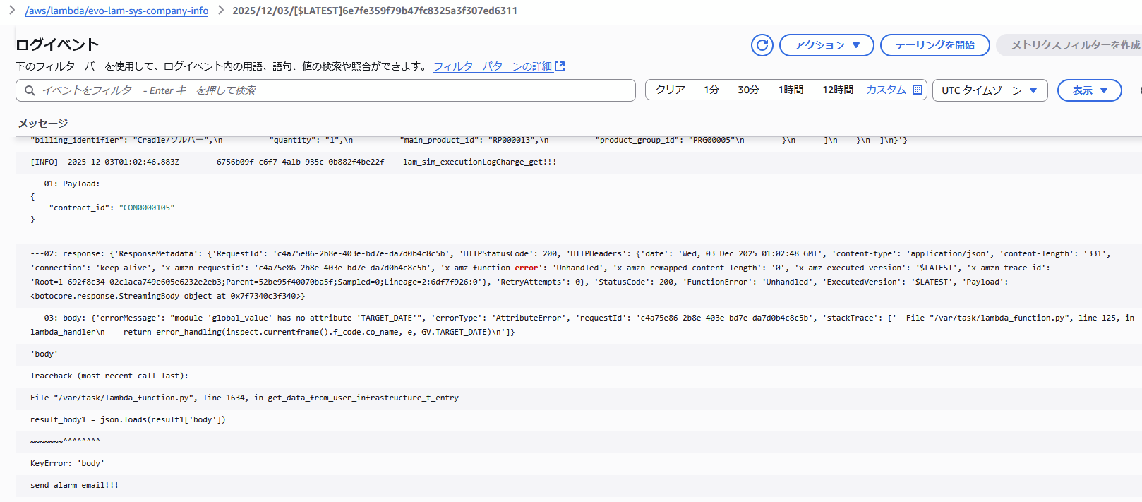 https://ap-northeast-1.console.aws.amazon.com/cloudwatch/home?region=ap-northeast-1#logsV2:log-groups/log-group/$252Faws$252Flambda$252Fevo-lam-sys-company-info/log-events/2025$252F12$252F02$252F$255B$2524LATEST$255D3e3c4bbca0d1484eb3371b582c79f3e1